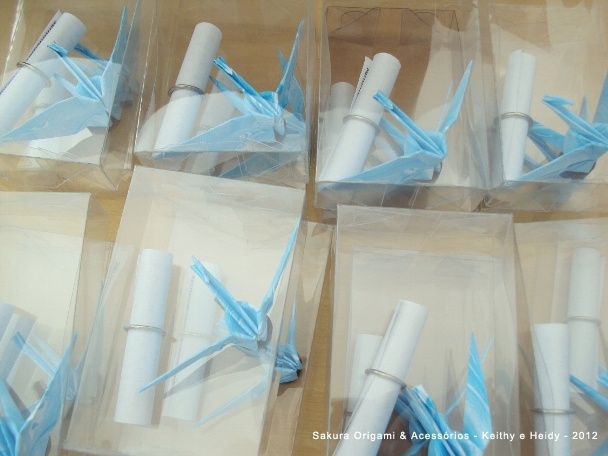 Cada lembrancinha foi acomodadinha em uma embalagem de acetato, juntamente com um rolinho, que contém o significado do tsuru. As tags de agradecimento foram feitas depois, pela própria mamãe.