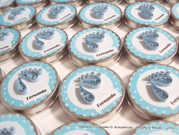 A mamãe Daniela adorou as latinhas com pezinhos de quilling e encomendou várias delas como lembrancinha de maternidade do Fernando para presentear quem fosse visitá-los!