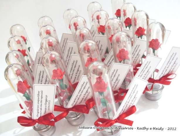Para a Cristiane, as madrinhas são pessoas mais que especiais! Ela encomendou várias mini rosas de origami no tubo pet para presentear as madrinhas do casamento da Tânia e do Rogério.