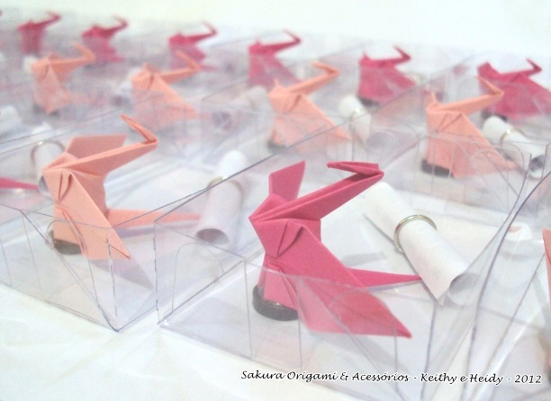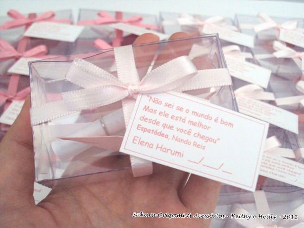 A mamãe Patrícia fez seu 1º contato com a gente através de nossa fanpage no facebook! Após várias conversas e trocas de ideias por email, as lembrancinhas da pequena Harumi estavam escolhidas: ímãs de tsuru na caixinha pet.