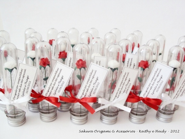 Mini rosas e mini cravos no tubo pet foram as pequenas jóias que o casal Izabela e Thiago, da cidade de São Paulo, escolheram para presentear as madrinhas e os padrinhos de seu casamento!