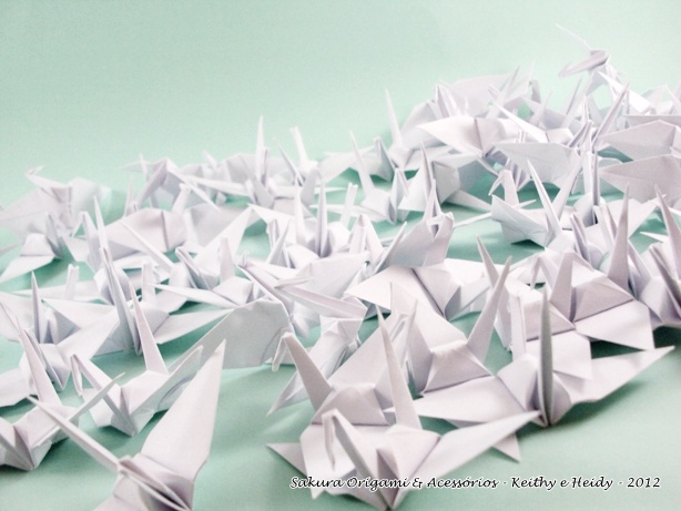 Ela encomendou três pacotes de decoração de 200 tsurus avulsos, todos branquinhos! Também nos pediu para que durante a confecção, mentalizássemos muitas felicidades para o casal Pamela e Flávio, que iria receber os tsurus como presente para decorar a festa do casamento 🙂.