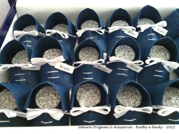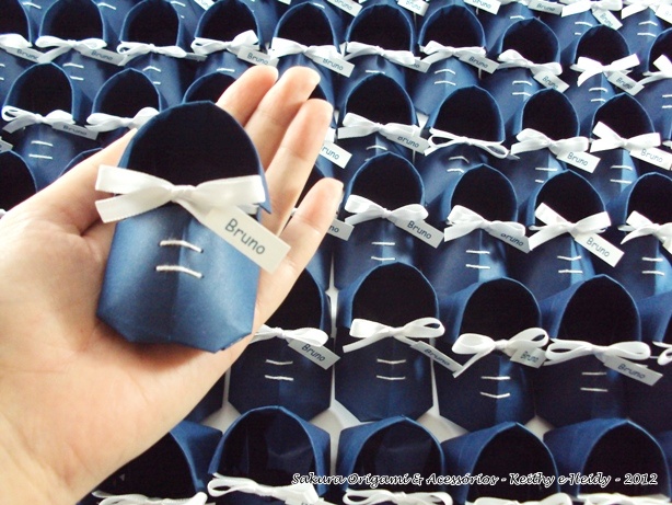 A mamãe Luciane, de São Paulo, nos contou que queria encomendar os sapatinhos de origami para o Nascimento do Bruno e que a intenção seria colocar um bombom Baci dentro de cada sapatinho. Então as cores escolhidas foram o azul marinho e detalhes brancos, para combinar com o bombom, que tem a embalagem azul e prata.