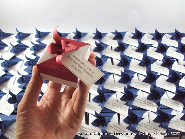 A Paula entrou em contato com a gente pedindo sugestão de lembrancinhas para a comemoração do 61º aniversário do Sr. Jaime. Dentre as opções que apresentamos, ela se encantou com o mini móbile de tsuru com caixinha e lírio. As cores escolhidas foram azul marinho e algumas vermelhas.