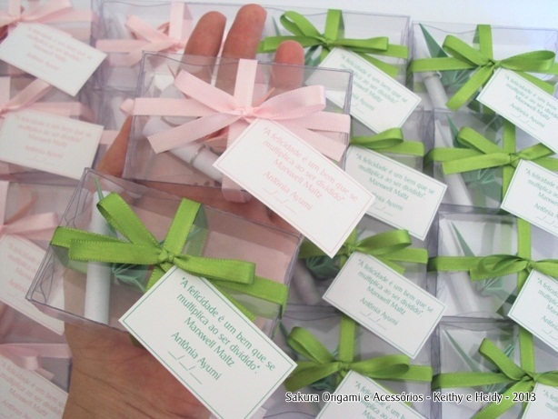20 ímãs de tsuru na caixinha pet, com fitinha de cetim e tag. Todos os detalhes combinando 🙂