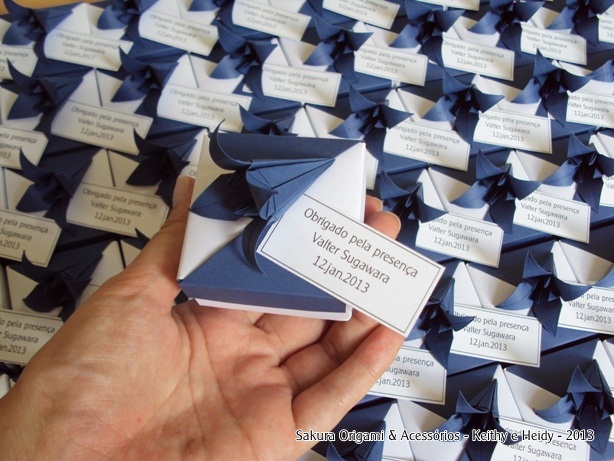 A caixinha com lírio é uma lembrancinha linda e sofisticada. Nas cores branco e azul marinho, ela foi o origami escolhido pela Márcia para ser a lembrancinha de aniversário do Sr. Valter.