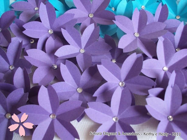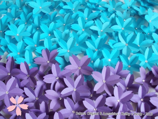 A Marina encomendou três pacotinhos de Flores de Sakura com strass para usar em uma decoração. Olhem bem as cores que ela escolheu: lilás escuro e azul turquesa! Gente, que coisa linda!! Fotos valem mais que mil palavras…