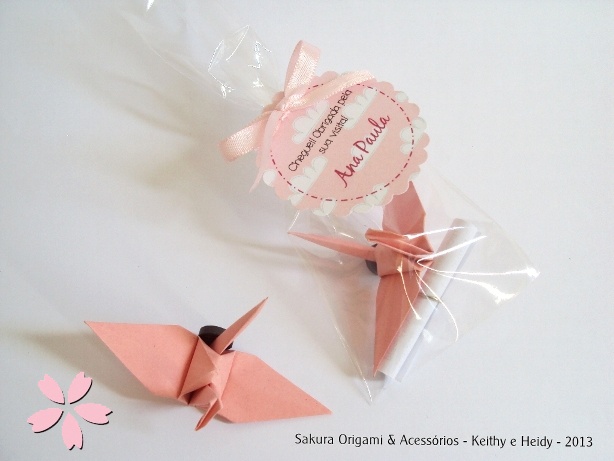 Esse modelo de lembrancinha é o mais simples que fazemos, é a essência dos outros modelos que temos. Por isso, ela foi batizada de ímã de tsuru essence.
