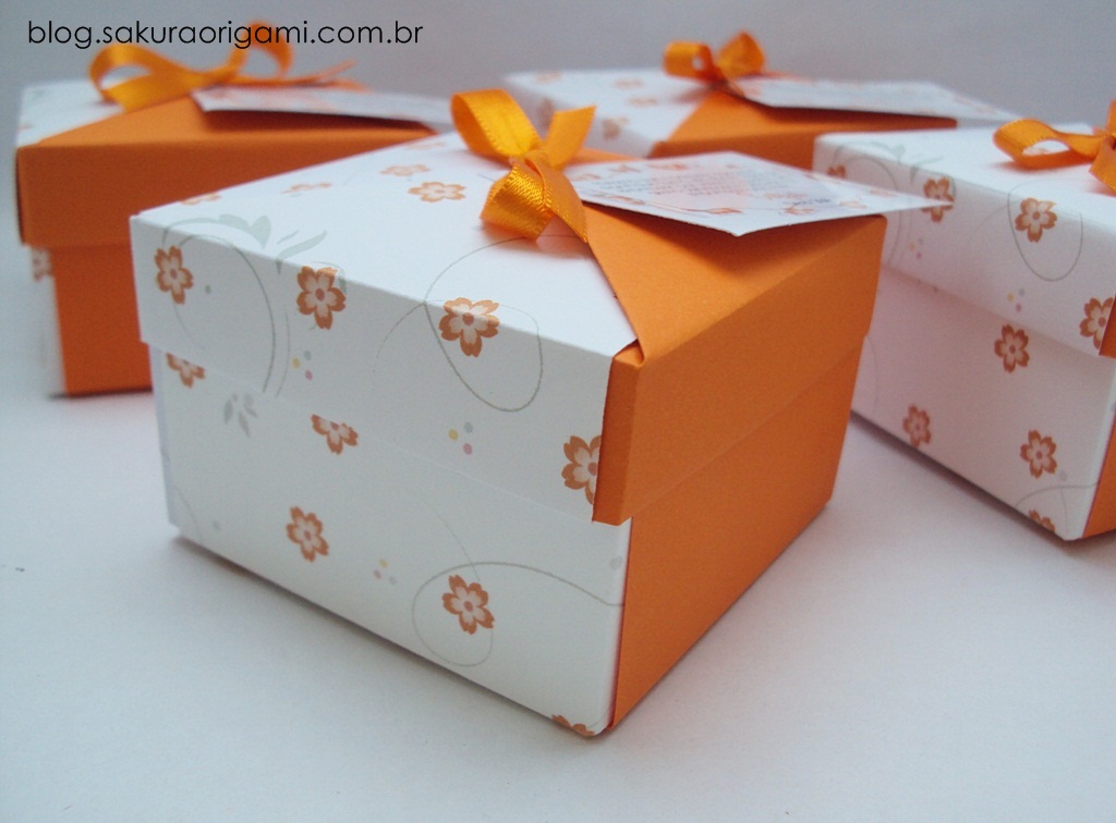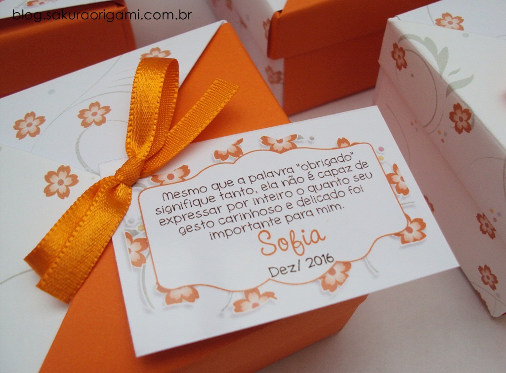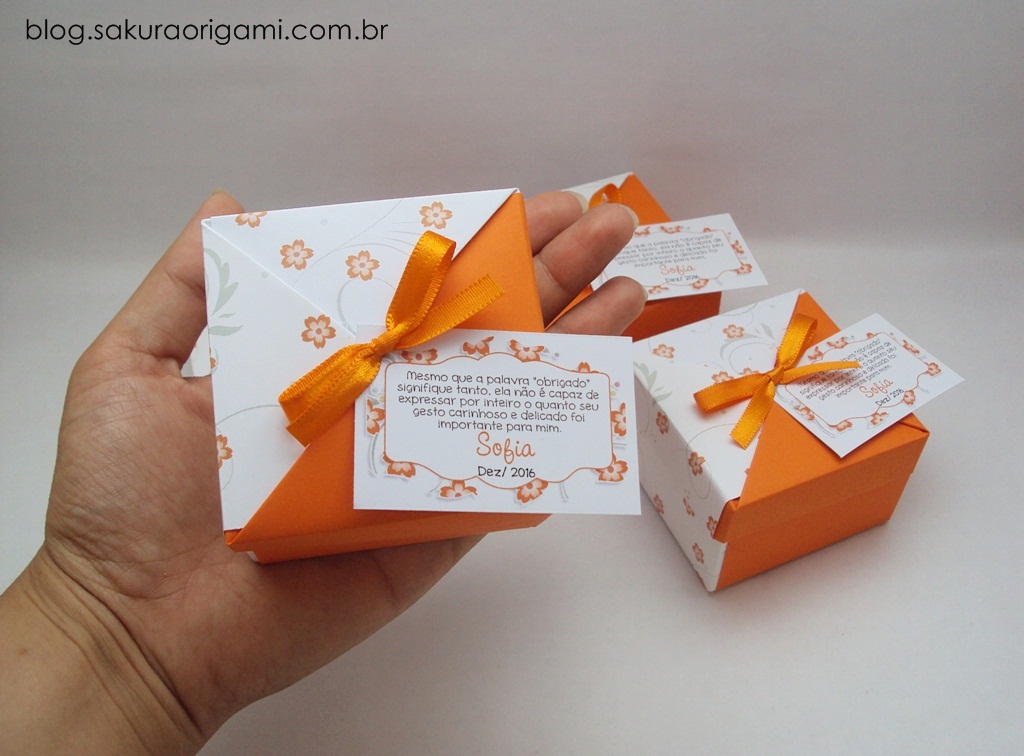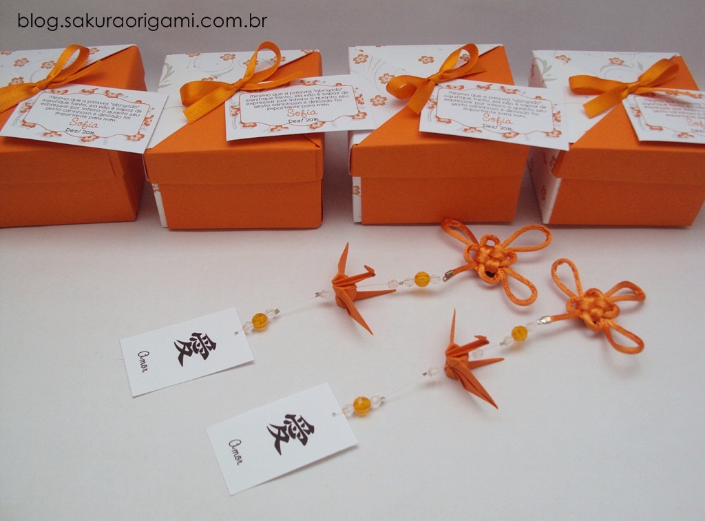 Ela nos pediu para confeccionar essas lembrancinhas com o ímã de tsuru e nó chinês com plaquinha, mas com uma caixinha especial! Uma caixinha para bombom, feita em origami.