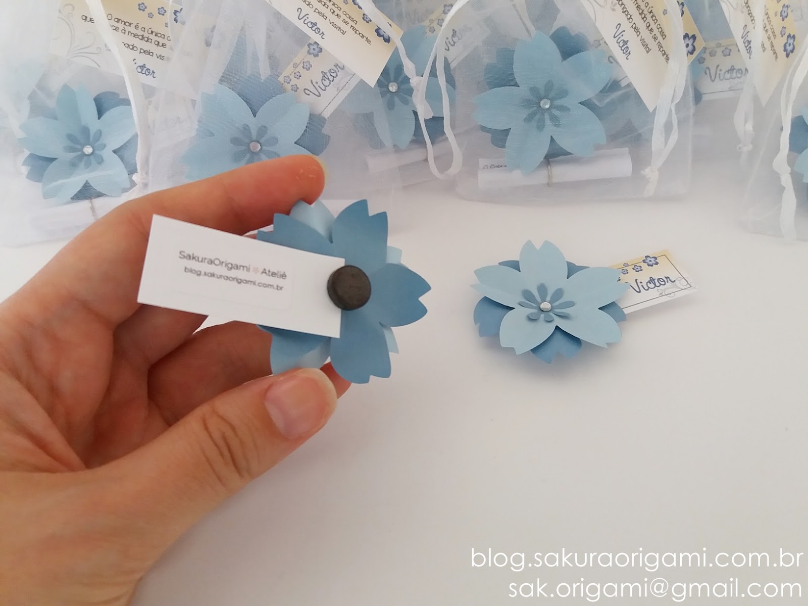 A mamãe Gláucia, da cidade de Belo Horizonte – MG, encomendou essas graciosidades de imã de flor de sakura em tons de azul, para a chegada do seu pequeno Victor.