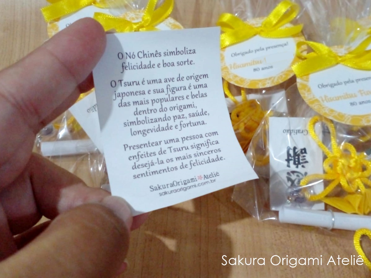 Essa linda encomenda foi feita para marcar um aniversário de 80 anos! A cor e o modelo mais pedidos são exatamente esses: mini móbile de tsuru e nó chinês no saquinho transparente (ou organza) na cor Amarela.