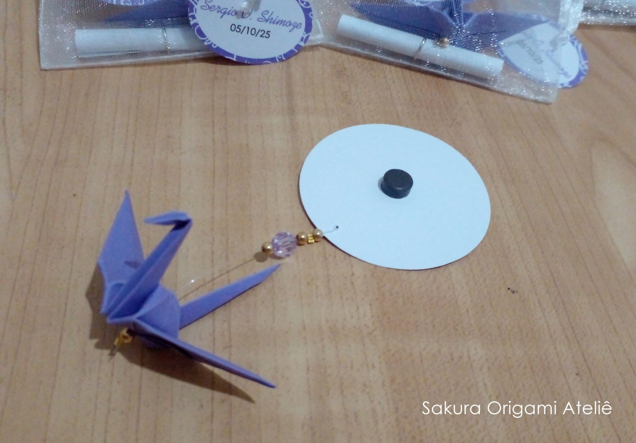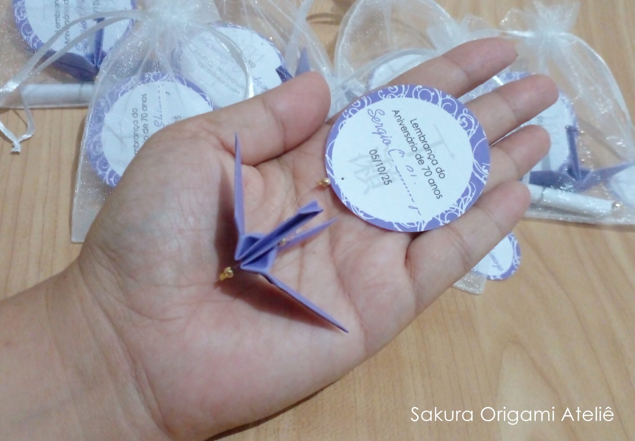 O modelo escolhido e mais usado para essa idade no nosso ateliê é o “ímã de tsuru pensamento no saquinho de organza“.