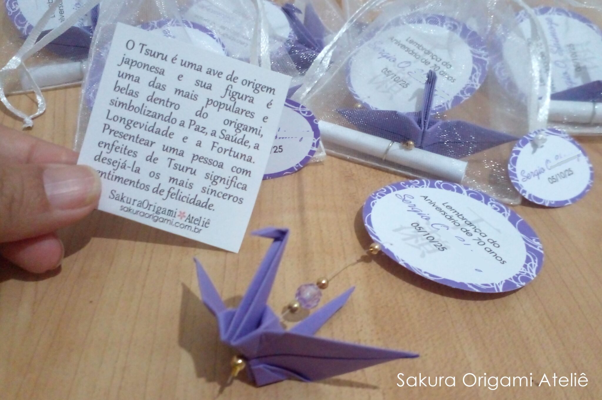 Além disso, também colocamos um explicativo sobre o significado do tsuru. Ele vai enroladinho e fechado com um elo, dentro do saquinho. Assim, todas as pessoas que receberem as lembrancinhas, poderão saber o significado lindo do tsuru.